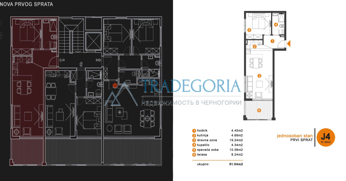 Квартира с одной спальней 51.04м2 состоит из прихожей, гостиной, отдельной кухни, спальни, санузла и террасы.