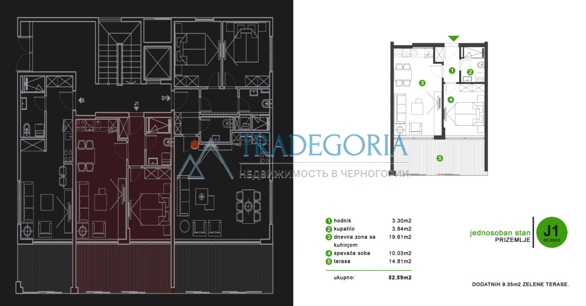 Квартира с одной спальней 52.59м2 состоит из прихожей, гостиной с кухней, спальни, санузла и террасы.