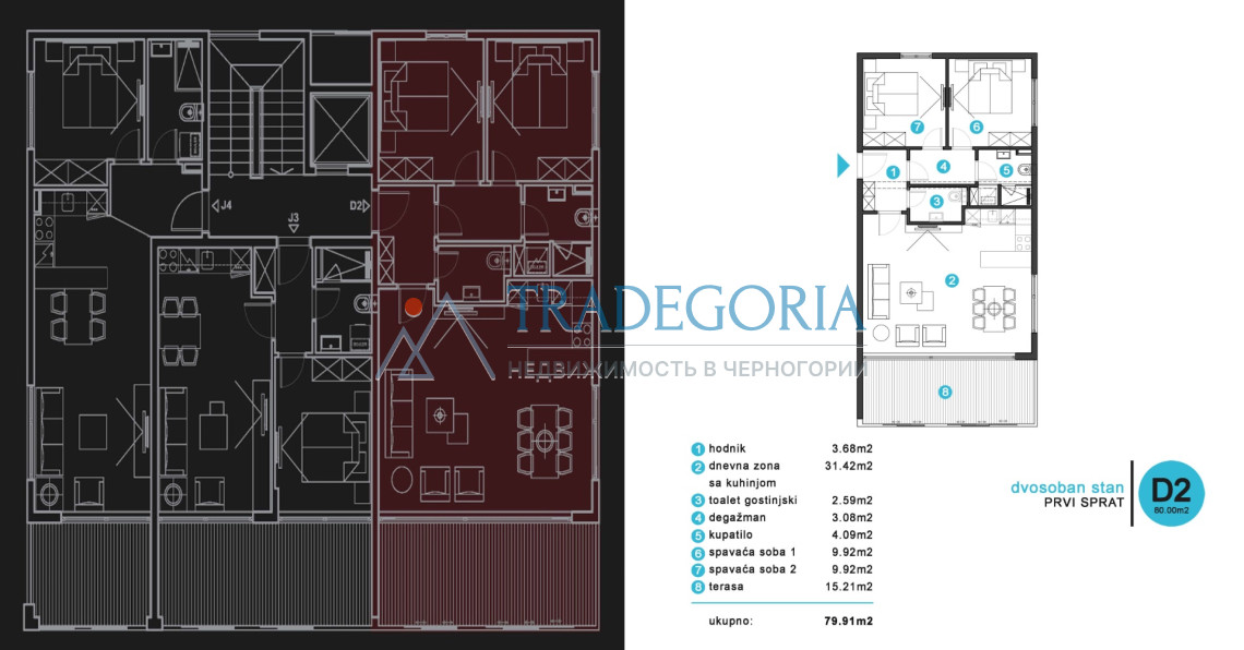 Квартира с двумя спальнями 79.91м2 состоит из прихожей, гостиной с кухней, двух спален, двух санузлов и террасы.